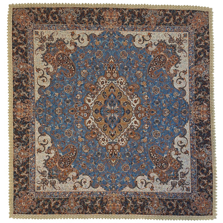 رومیزی مربع ترمه نفیس ابریشم کد TRM220 رنگ آبی آستر آبی لبه یراق دوزی