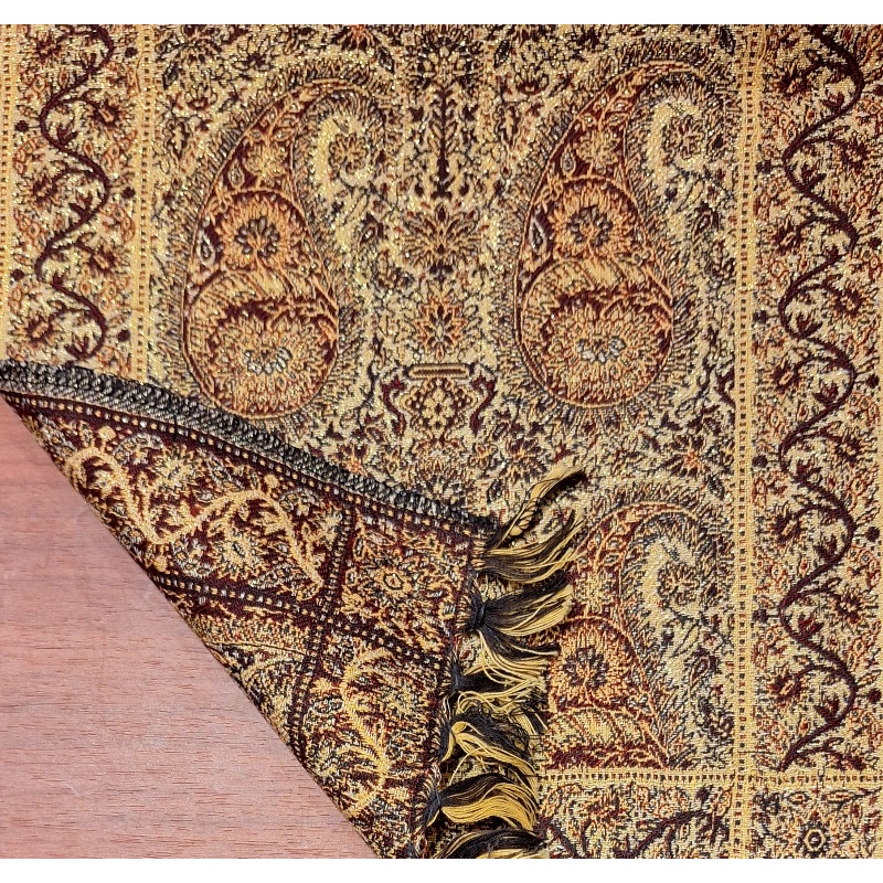 سایر توضیحات: این پارچه گرانبهای دارباف، ترمه نمی باشد بلکه طرح ترمه است و دارای الیاف بسیار لطیف است. انبوه و ظرافت ریشه های دو طرف این رومیزی که همان تارهای پارچه است، گواه تراکم بالای این اثر زیبا را می دهد. این رومیزیها آستر ندارد.