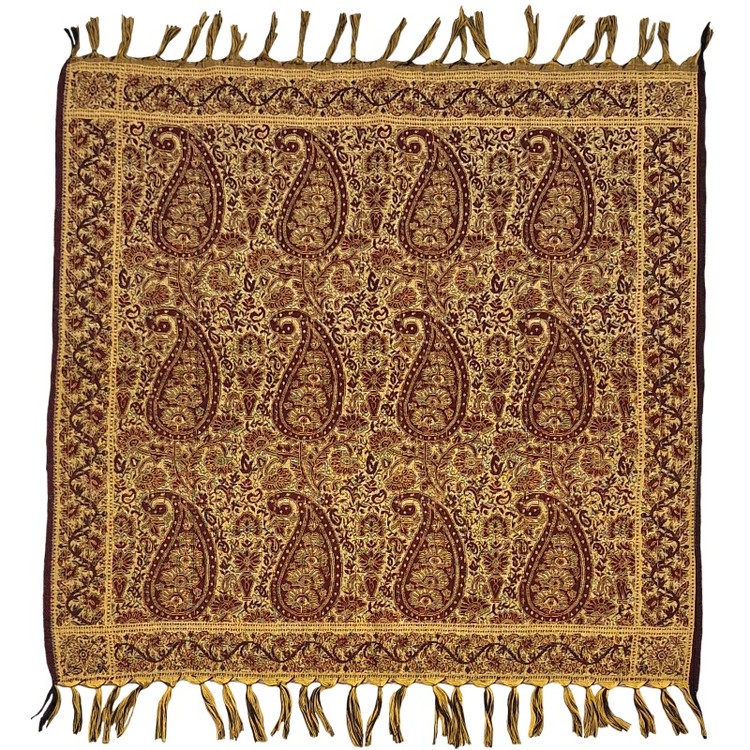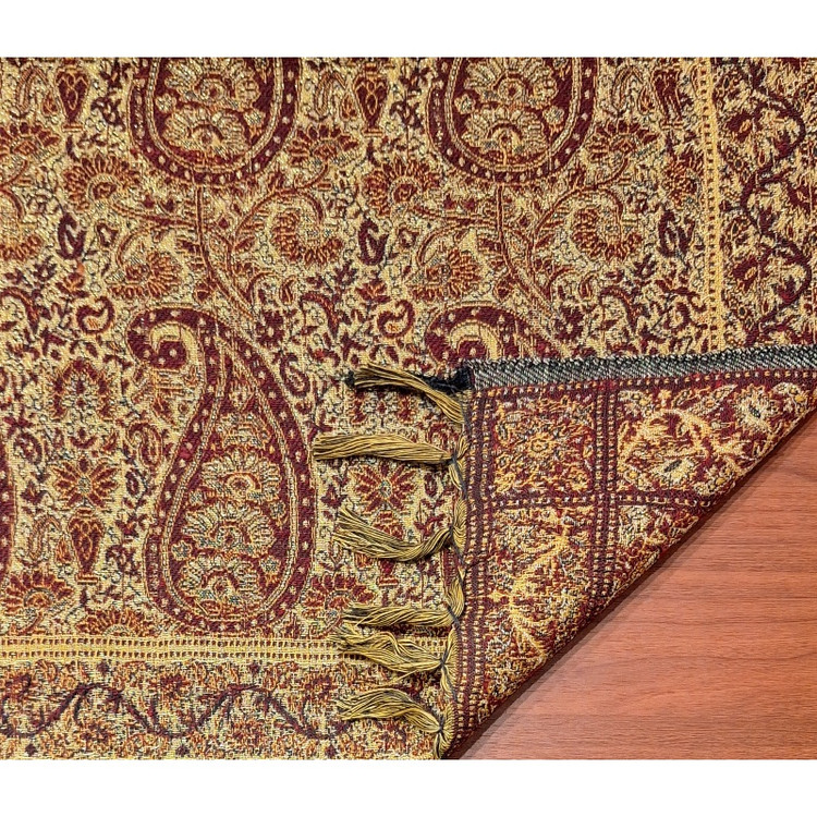 سایر توضیحات: این پارچه گرانبهای دارباف، ترمه نمی باشد بلکه طرح ترمه است و دارای الیاف بسیار لطیف است. انبوه و ظرافت ریشه های دو طرف این رومیزی که همان تارهای پارچه است، گواه تراکم بالای این اثر زیبا را می دهد. این رومیزیها آستر ندارد.