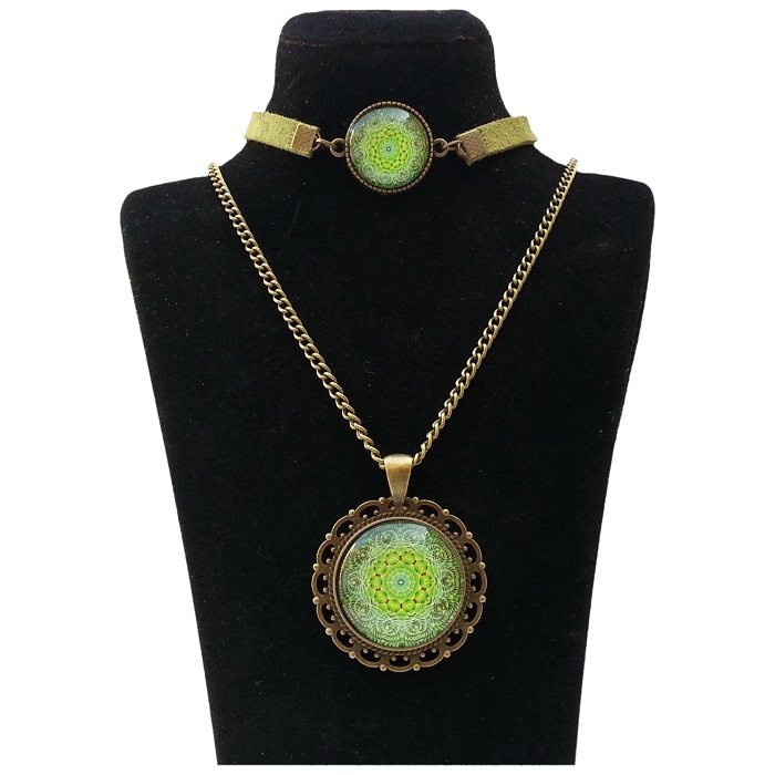 شاید بسیاری از خانم ها علاقه مند به استفاده از گردنبندی بلند بر روی پوشش های مختلفشان باشند . گاهی میتوان با کم ترین هزینه از یک گردنبند خوب استفاده کرد . این گردنبند زیبا به همراه دستبند آن که طرح اصیل ایرانی است دارای قاب فلزی با حاشیه ای زیبا می باشد . این گردنبند و دستبند ساخته شده از زاماک که از مشتقات روی است می باشد . بر روی آن هم از رزین استفاده شده است . رزین ترکیبی طبیعی یا مصنوعی بوده که تحت شرایطی سفت می شود و سطحی براق و شفاف ایجاد می کند .